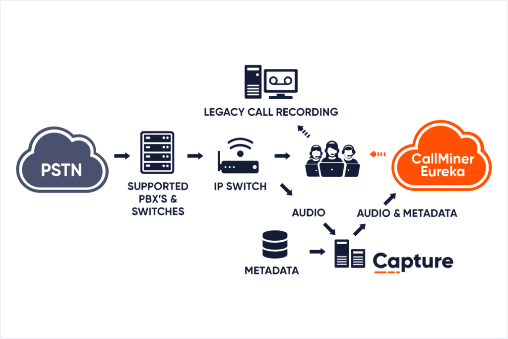CallMiner Capture works with a wide range of contact center infrastructures and audio codecs. Standards-based IP and SIPREC support make it easy and efficient to acquire high fidelity audio with existing call recording or for organizations that do not currently have a call recorder in place. A self-configurable, premise-based installation enables secure access to audio and transcription data within CallMiner.