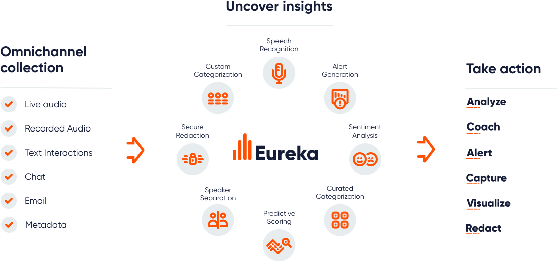 No staff training or burdensome tasks needed. Organizations focus on improving services without the day-to-day activities of managing Eureka. Eliminate manaul QA of agent performance, new product roll outs & announcements, advisories and customer service sentiments. Connect the dots between human understanding and the tangible action required to turn it into business improvement.
